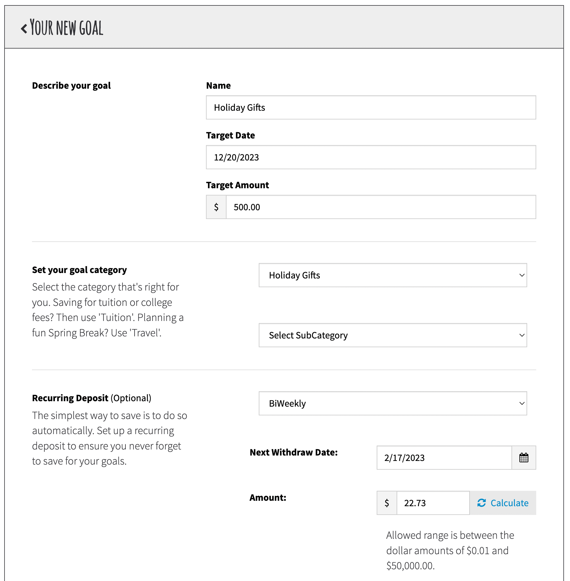 Here's an example of a savings goal I set up for holiday gifts, I'd like to have $500 by December 20, 2023: