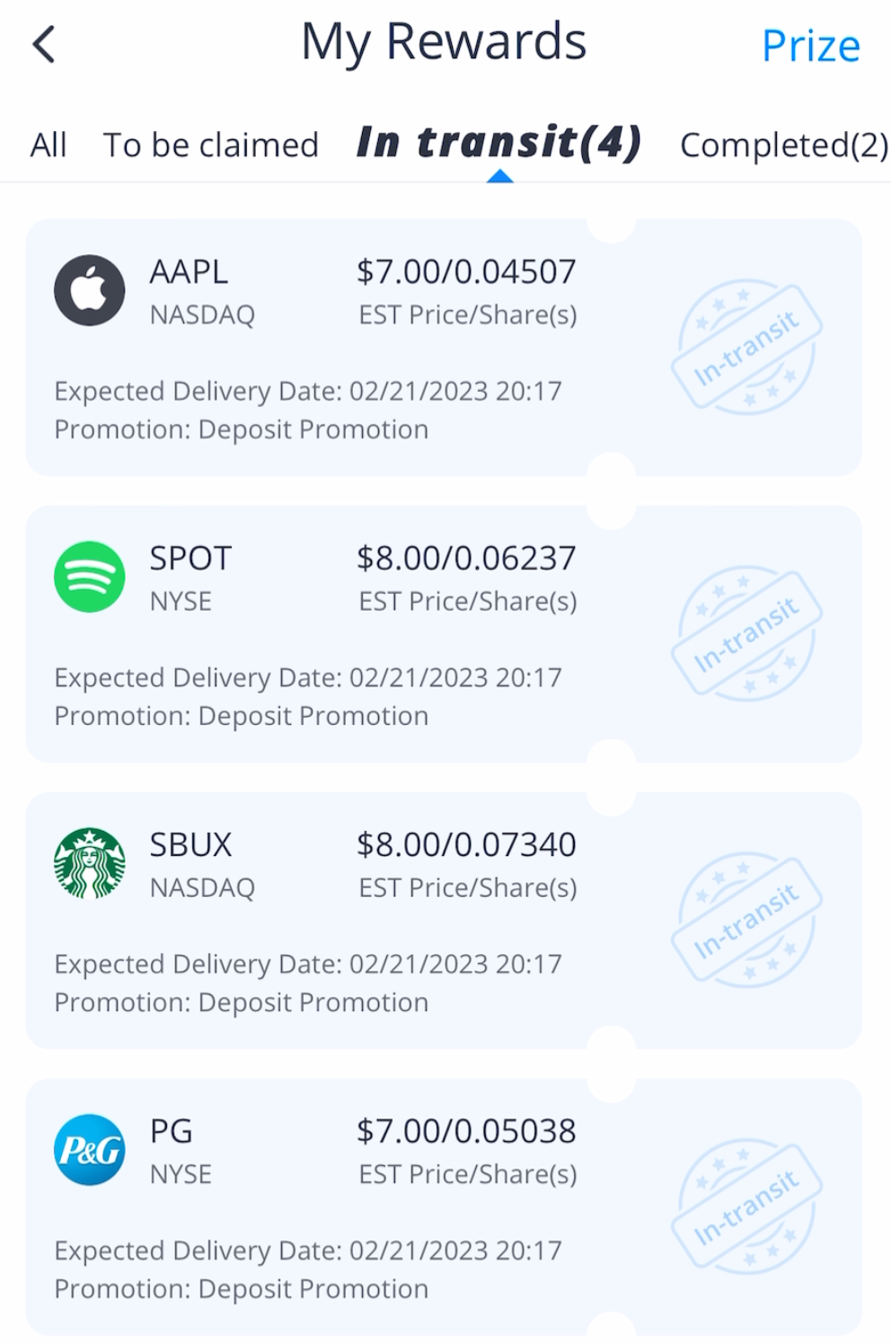 4 account funding shares: AAPL ($7), SPOT ($8), SBUX ($8) & PG ($7) for a total value of $30.