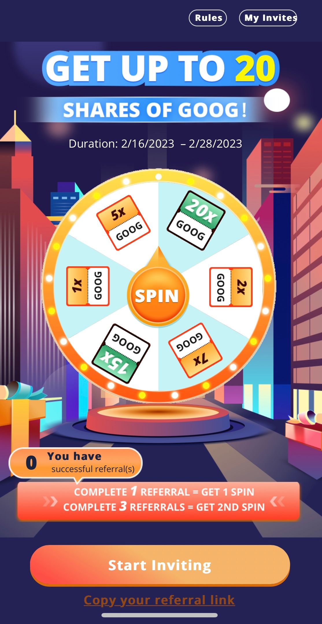 With this promotion, you can earn from 1 to 20 Alphabet class C shares (GOOG) for your first referral, 2nd referral during the period 10 fractional shares, 3rd referral another spin to earn 1 to 20 GOOG shares and then 10 fractional shares for referrals 4+.